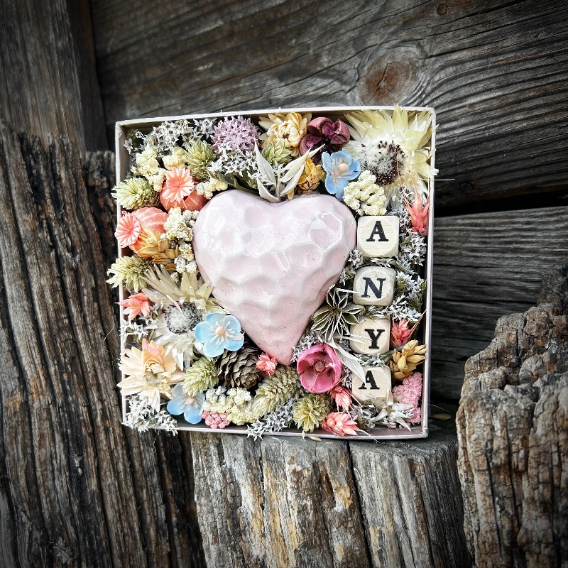 A doboz középpontjában egy finom, romantikus hangulatú, hazai gyártású kerámia szív található, melyet gondosan válogatott, harmonikus színvilágú szárazvirágok ölelnek körül. A természetes textúrák és pasztell árnyalatok időtálló eleganciát sugároznak.